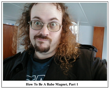 Nervously fluffing my hair had become a habit - whenever I got antsy or excited, I'd run my fingers through my hair real quick. I never really realized it was a habit - contrary to popular opinion, my little quirks like my "woo hoo!"s or my rubbing my hands together are not affected gestures, but geniune examples of fucking strangeness - until the day I was at a Magic tournament and the three guys next to me screamed, "DO THE FERRETT!" and started fluffing their hair in syncopation. Whoops. So anyway, this was my last fluff - and man, was I nervous. They brought me in to this hair parlor, which had free coffee and chocolate - I needed that chocolate - and sat me down in the chair. Then began cutting. As the hairstylist began slashing and gouging at my head, she asked, "Have you had brain surgery recently?" WHAT? "Well, I mean... Did you hit your head? Stitches? What happened?" Apparently my tangles and knots had been pulling out gigantic clots of my hair in the shower - running my fingers through was not the Gordian detangler one required for healthy hair - and I had clumps and bald patches which made it look like I had recently had open wounds on my head. She called other hairstylists over to look, who nodded grimly and agreed she had a Job To Do. She put the shears to me and annihilated....