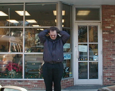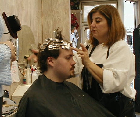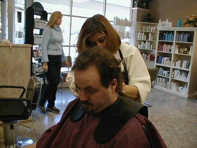 But unfortunately, I was balding. And it didn't seem to be improving. Gini kept coming up to me and giving me subtle hints, like: "Hey, you look bald. Get a haircut," or: With these loving words, I finally realized the truth: Between my receding hairline and my balding top, I was coming to look like my archenemy - a record executive. Yes, I could tie it back and try to keep my cool quotient... But untethered, my hair would shout, "Hey! He's thinning and vain!" Thus, I resolved to have it cut. This was not an easy decision for me, as - and I really am not exaggerating here, as excruciating as it is to admit - to cut my hair was to face death. Seriously. Once I cut my long hair, it would not grow back. Everyone gave me a big line of horseshit about yeah, it grows faster when you cut it, and when it's in better shape without all those split ends you'll be fine, but I knew they were just fuckwads without a clue. Really. (And for the record, it's grown just as slowly since I cut it, proving me absolutely right.) I first grew my hair in my youth, mostly to be cool. Then I realized an important factor: It was easier to get chicks when you had long hair. Then, later on, it was so enscribed in my identity that I could scarcely imagine not having it. My ridiculous bouffant had been with me since my youth... And once shorn, it would never return. In other words, cutting my hair would be acknowledging that I was no longer young... And could never go back. From now until my death, I would never have hair that long again. "That's ridiculous," splutters Gini. "It's just hair." "Oh yeah?" I ripost. "Then why aren't you going to Pearle Vision to get those bifocals you're pretty sure you need?" "Well, um... It's..." Fucking thought so. I tried to have it cut back last March, but I needed hand holding - and Gini did not understand how traumatic this was. I made an appointment to have the hair cut, nervous and on the edge of bolting, and Gini required an hour-long appearance at her after-work party before we went... Completely breaking my nerve. I fled, unable to do it. But when I went home in January, I knew that a) it was time, and b) I could do it in secret, thus surprising Gin when I returned, and c) my mother, who had fought me O these many years regarding my hair, would understand completely. "Mom," I said, "Do you know of a good hairstylist? Someone you trust?" "Why?" "I think I want to cut it off." Mom leapt to the phone and made an appointment right then and there, locking me in, and promised me a hearty lunch afterwards. Good ol' Mom. Sometimes wives screw it up, but Moms always understand how stupid you can be. So we went, digital camera in hand to record this momentous occasion. Here is a rather sullen picture of myself, showing the last time I nervously fluffed my hair.