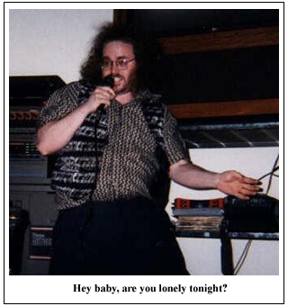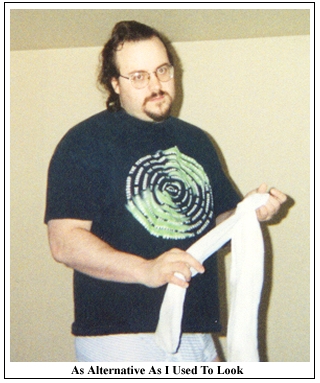 While I was having all the foil laced into my hair, I casually remarked to my mother, "Will this help stop the aliens from beaming transmissions into my head?" "No," she replied, "It amplifies them." The hairstylist, a rather nice and normal middle-aged woman, looked shocked at this exchange - then smiled tautly. "That's right," she said, recovering smoothly, "He's the science fiction writer." So I walked out. Wanna know what my new hair looks like? Well, I dunno myself anymore. Because I got it cut closer. Not that I wanted to - but two months after my initial haircut, it was starting to look shaggy. (That's right - I said two months. Wanna tell me how my healthy hair grows back quick? Hanh?) I didn't know any hairstylists in the area, so I asked at my local comic shop where a salon was. Those who understand Comic Shop Coiffeurs will realize the disaster in the making here... Yet I digress. So I asked, and they told me there was a SuperCuts in the mall - but they didn't recommend it. Guiseppe the haircutter was their choice for everyone there, a little old man who only charged eleven bucks a haircut. And only drove those haircuts on weekends. So I walked in, knowing that my friend Jeff also had his hair cut by Guiseppe, and had said he was a nice guy. The parlor was old-fashioned, all right, right down to the plastic jar of lollipops for the kids and the combs in that Mysterious Blue Fluid. Guiseppe was happily snipping about the ears of an older gentleman with thinning white hair, making conversation in a thick Italian accent I associated with old Nintendo games. "It's a-me! Guiseppe!" He eventually called-a me over, and asked-a me: "So! You wanta hair-cutte, right? What kinda haircutte ya want?" "Ah, just a regular haircut," I said. "You know, short, but..." "Right!" he interrupted, whipping the white cloth around my neck in an experienced sweep. "I give-a good haircutte!" (This is not exaggeration, by the way. Ask Jeff.) He began asking me questions, and vowmp - with a flick of his clippers, a fist-sized clump of hair settled on the cloth in front of me. I grimaced, but realized that like a roller coaster or a bad acid trip, there was little I could do but wait until the end of the ride. "So where-a yu frum?" he bellowed. Vowmp. "Alaska," I said. Vowmp. He was wielding the electric clippers like a lightsaber. "Alaska!" he cried joyously - and vowmp. "I hear that's a pretty area!" Vowmp. "Why yu move-a here, hanh?" Vowwwwwwwwwwmp. There was a breeze on the back of my neck. I had not felt cold air against the back of my neck for years. The thing is, for what it was it was a pretty good haircut. I've spoken to other victims of Guiseppe - we formed a support group - and he has basically one style, which he has honed to perfection. No matter what you ask for, you pretty much come out of Guiseppe with a close-cropped nape, a thatch of hair on the top, and a tightly-clipped boundary about the ears. Gini loves it. I'm not so sure, but as long as she keeps making that sweet sweet love to me and my head, I guess I can deal with it. There's only two real problems with the short hair; the first is that I have begun to have Bad Hair Days. Now, when I had The Hair, which was all over the place, a thing like a Bad Hair Day didn't exist. Every day was a bad hair day... Or a good hair day, depending on how you looked at it. It was a tangle that defied conventional analysis, simply because it was just me. The only thing that was a given was that I had to wash the sucker every morning - otherwise, it would stick out in all directions in an Alfafian nightmare. Now when I wake up, I have to wash it and comb it. If I don't, then it looks funny... And not funny like I'm used to. It looks bad. So I have to add hair care to my morning palette of brushing my teeth, cleaning my nipple, taking my medicine, and... What? I didn't mention my nipple? Oh, that's right. The other problem was that after I shaved my head, I felt really odd. I was used to getting weird looks on the street continually - so used to it, in fact, that I only noticed it when I didn't get them any more. I walked into stores and nobody paid any attention to me. Mothers ceased shielding their babies when I walked by. Furthermore, I had lost cred. I used to be able to sway past gangbangers and metalhead alike, giving them a wary eye - and they would look back at me, marking me as One Of Their Own. Sure, a fat and elderly One Of Their Own, but nonetheless I was someone Not To Be Fucked With. Now with my cropped tonsure, I was simply another person, and potentially muggable. This irritated me. And what irritated me more is that the cute Goth chick at Joseph-Beth, who had always made a habit of flirting outrageously with me every time I had shown up, ignored me callously after the haircut. I had lapsed into utter and bland normality - and between that and my sudden and terrifying yearing for solid lawn care, I was becoming an alien to myself. So, of course, I did the only thing a wise young man like myself could expect to do - I shoved a steel spike through my nipple. Yes, yes, I know - much like Dance Dance Revolution, this really isn't something you should do when you're old and saggy. And yet I'd always kind of wanted to do it, and discovered that it was fairly cheap - only thirty bucks to disfigure yourself professionally? Count me in! So I went. It was a combination tattoo parlor and piercing shop, and had the usual tattoo acoutrement - shaggy fat guys with more metal than cartilage in their face, pasty teenaged girls getting rose tattoos that they'd regret during their midlife crisis, and a row of generic tattoos that you could get cheap, drawn on wax paper and tacked to the wall. I myself have never gotten a tattoo, mainly because I have never really had an attachment to anything that I would want on my body for life. I mean, I'm fond of skulls with snakes coming out the eyeholes... But do I really want to look at one until I die? Likewise, 