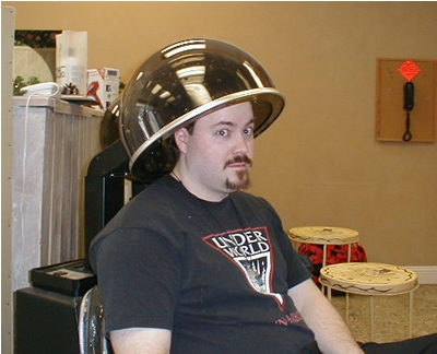 And I was terrified - hey, look at that picture! It's the picture of terror! - mainly because without my glasses, I had no idea what I now looked like. Did I look like a fuzzy melon? A mustached chia pet? No clue. All I knew was that somehow, I had been scalped.... Ironically enough, now that I had less hair than ever, they felt the urge to dry it. (This was a classy joint, remember?) They stuck me under this hair dryer for about thirty minutes; all the while I just sort of stared at my mother like a lost puppy, saying, "It looks okay, right? It looks okay? Right?" My mother smiled and said I looked wonderful...